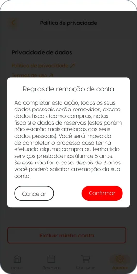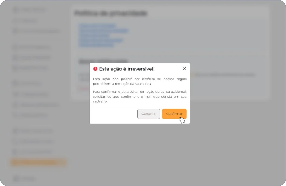 Após estar ciente destas informações, basta clicar em “confirmar” para dar continuidade na exclusão da sua conta.