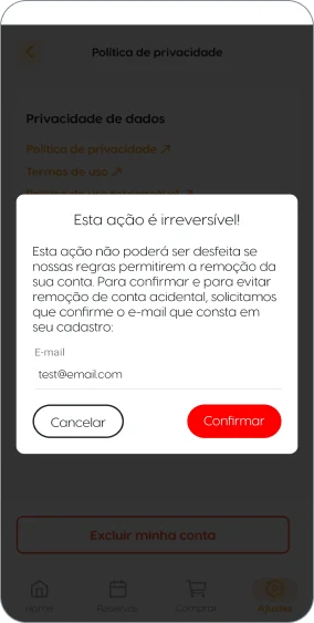 5 - Para finalizar o processo de exclusão da sua conta, basta adicionar seu e-mail que consta em seu cadastro e clicar em “confirmar”.