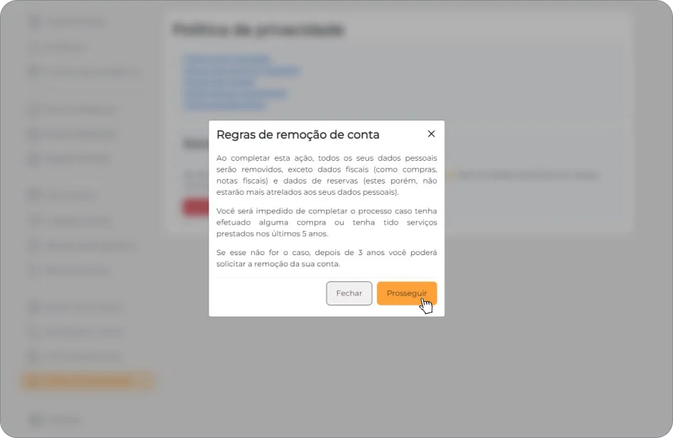 Após estar ciente destas informações, basta clicar em prosseguir para dar continuidade na exclusão da sua conta.